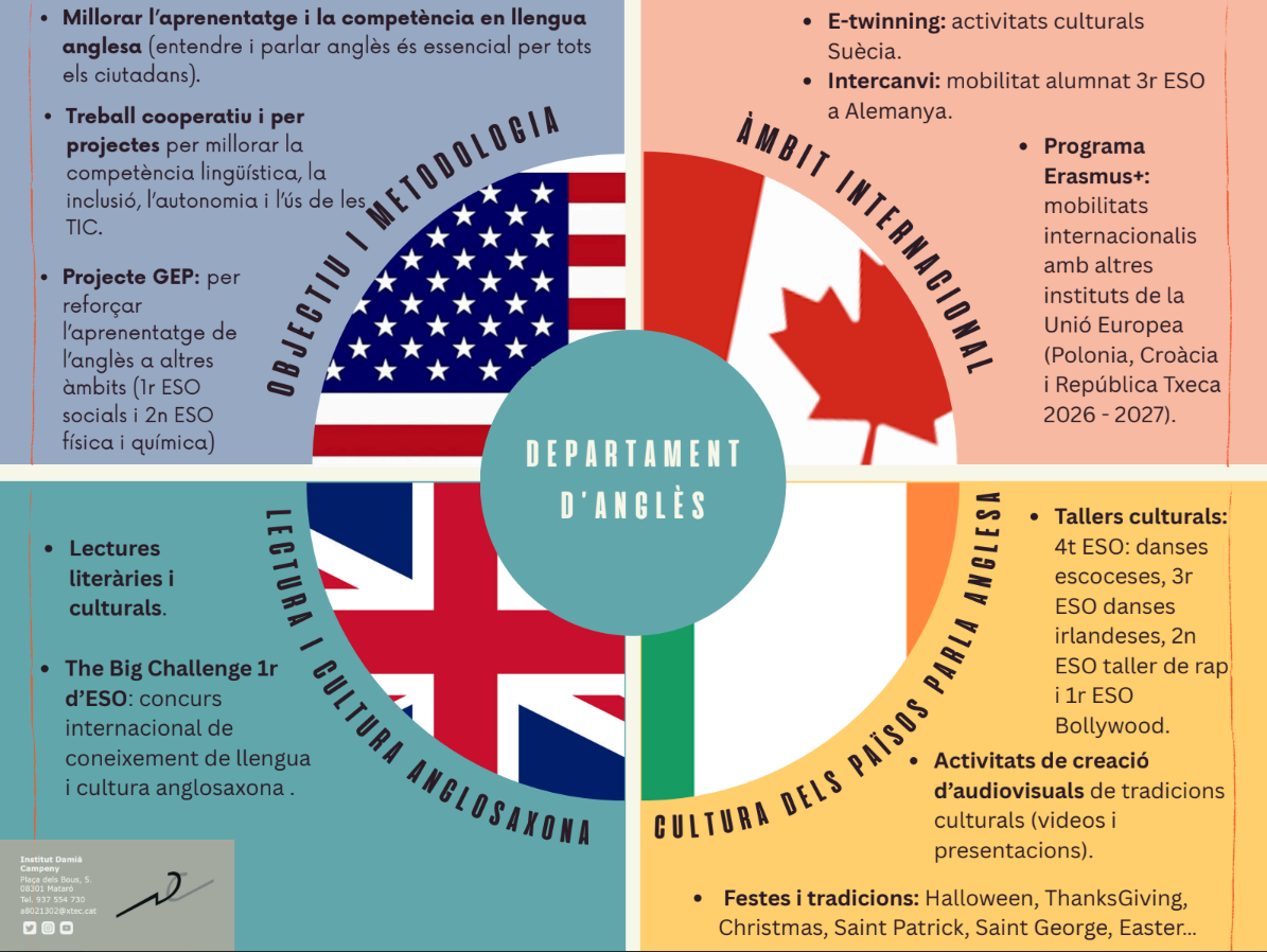 Entendre i parlar anglès constitueix una habilitat essencial que tots els ciutadans necessiten. L’objectiu del departament d’anglès és millorar l’aprenentatge d’aquesta llengua.