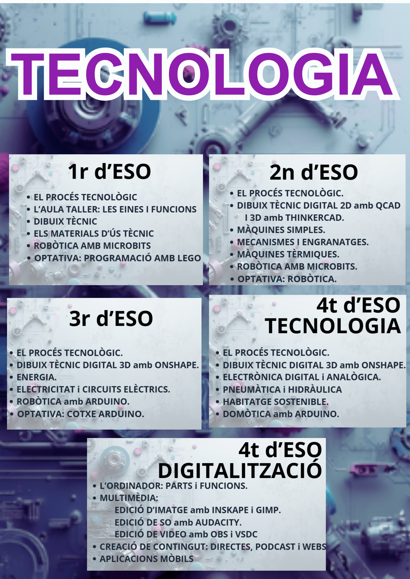 Vivim en una societat que està en canvi constant. Materials, objectes tècnics, comunicacions, alimentació… són un exemple d’aquests canvis. Per aquest motiu és necessari potenciar el coneixement científic des de l’àrea de tecnologia per entendre aquesta realitat. L’assignatura de tecnologia al llarg de l’ESO va lligada al procés tecnològic, aquest és un mètode de treball sistemàtic que facilita la realització de projectes. Es parteix d’un problema o requeriment inicial, després es fa una cerca d'informació per tal de poder fer una pluja d’idees i poder triar la millor. Tot seguit es planifica el projecte, es porta a terme i s’avalua buscant els punts dèbils per realitzar les propostes de millora. Tecnologia és una matèria obligatòria de 1r a 3r de la ESO. A 1r d’ESO, trobem la tecnologia integrada amb STEAM, creant un vincle més fort entre les ciències i la tècnica. A 2n d’ESO la trobem sola. A 4rt d’ESO tenim l’opció d’escollir la matèria de Tecnologia i la matèria de Digitalització de forma separada.
